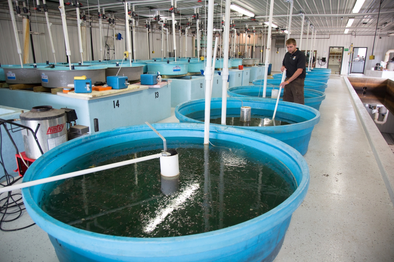 Biologist cleans Lake sturgeon tanks.