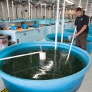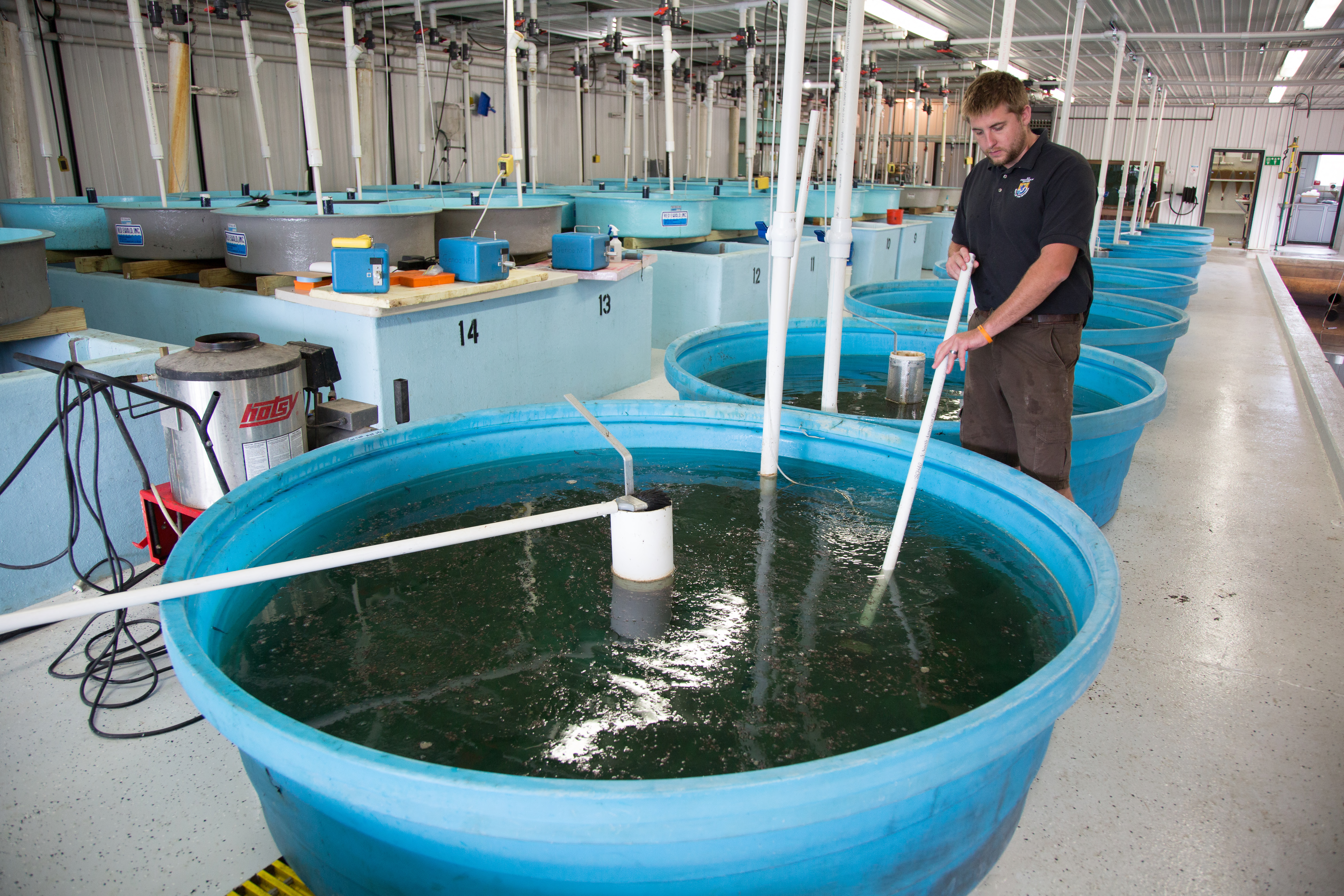Biologist cleans Lake sturgeon tanks.