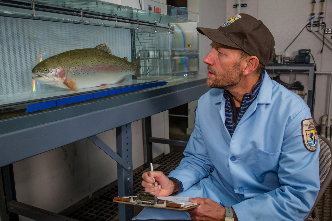 Biologist conducts a swim test on a large Rainbow trout in a swim tunnel.