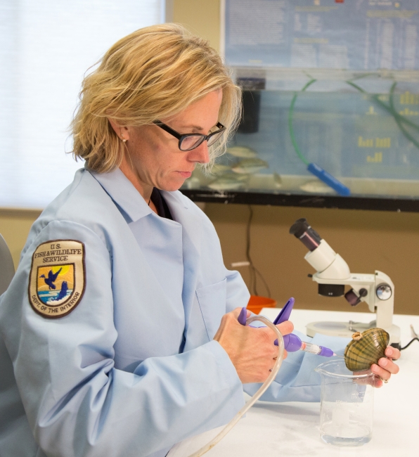 Extracting glochidia from the plain pocketbook (Lampsilis cardium) using the syringe method. The mussel is held over a clean container with the ventral margin facing up and the anterior end facing away. Photo: Ryan Hagerty, USFWS.