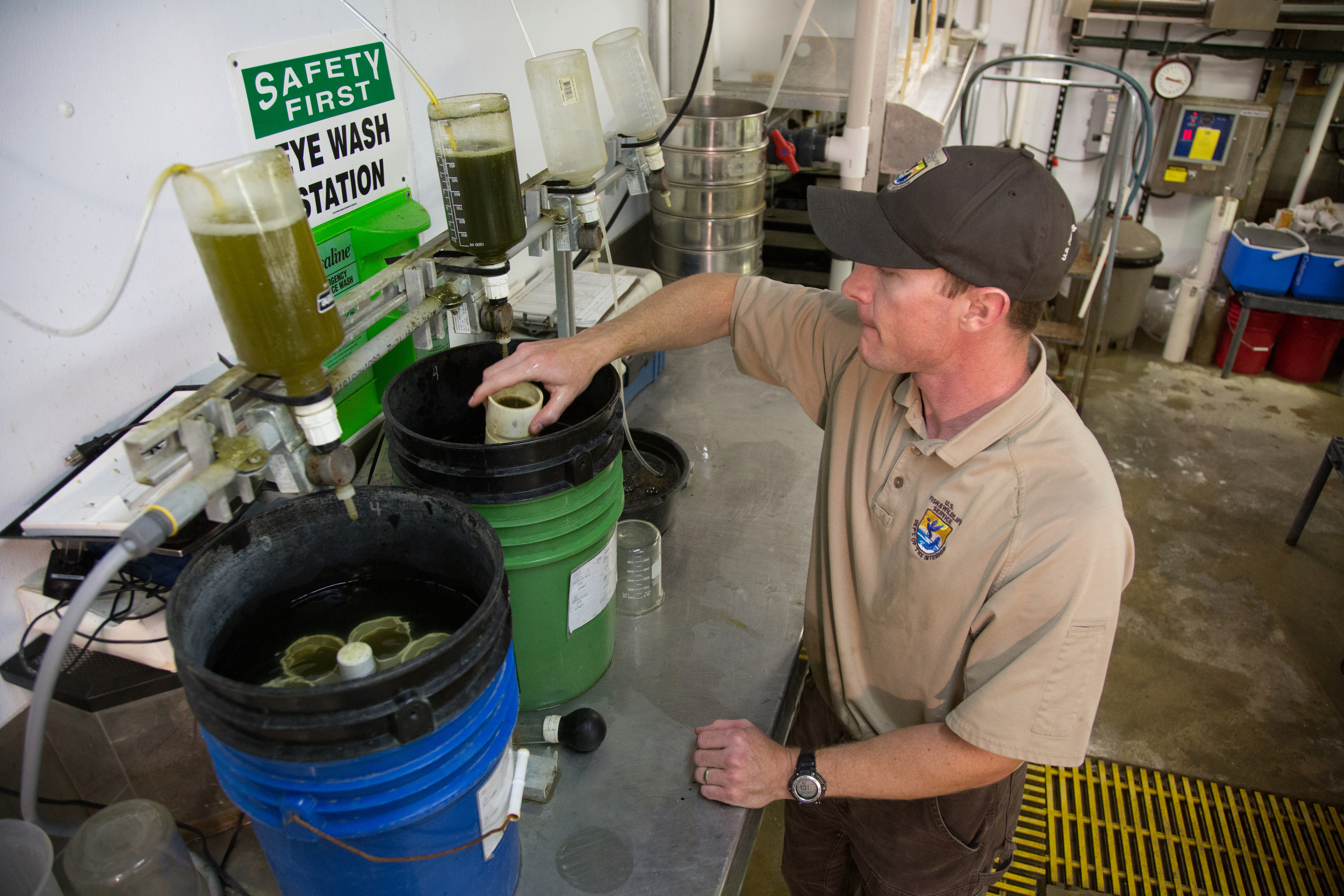 Biologist uses "mucket buckets" to grow juvenile freshwater.mussels in the lab