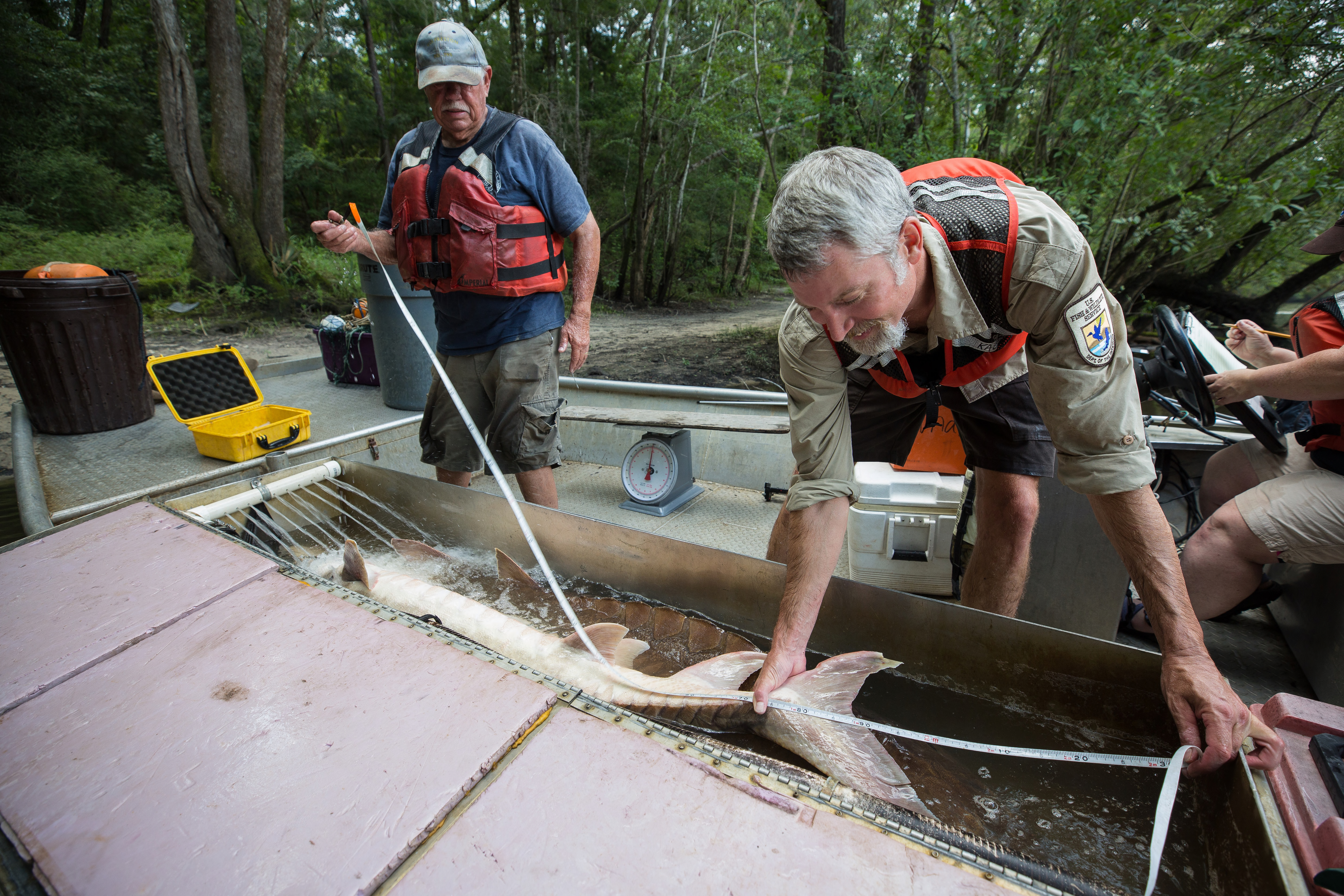 Biologist with gulf sturgeon on the Choctawhatchee River