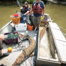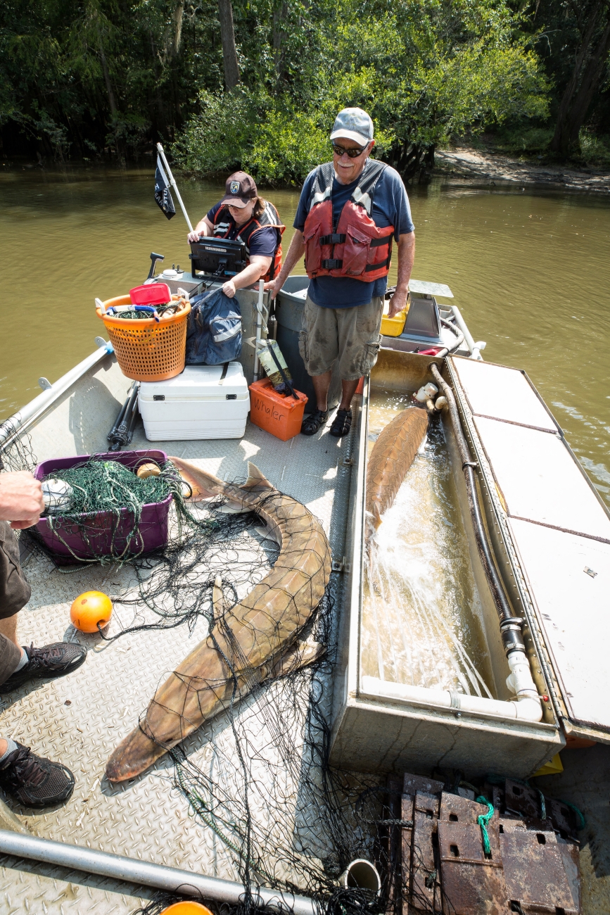 Biologist with gulf sturgeon on the Choctawhatchee River