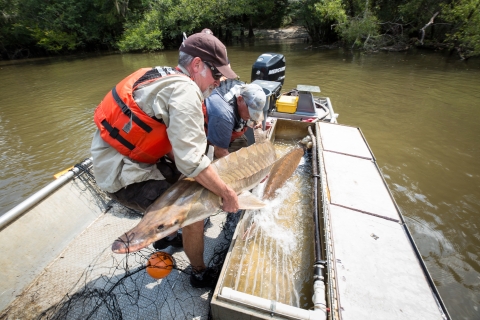 Biologist with gulf sturgeon on the Choctawhatchee River