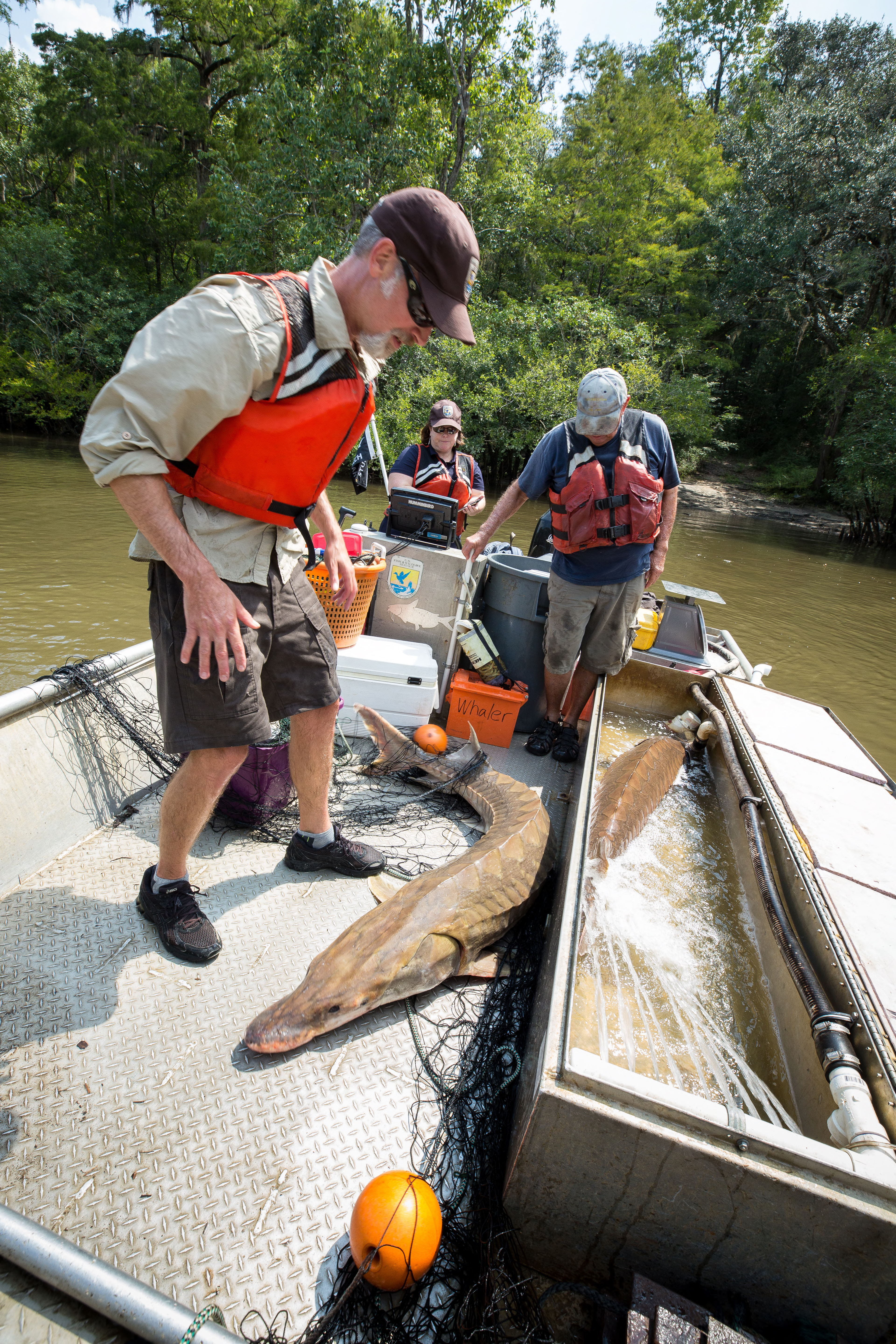 Biologist with gulf sturgeon on the Choctawhatchee River