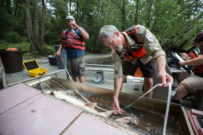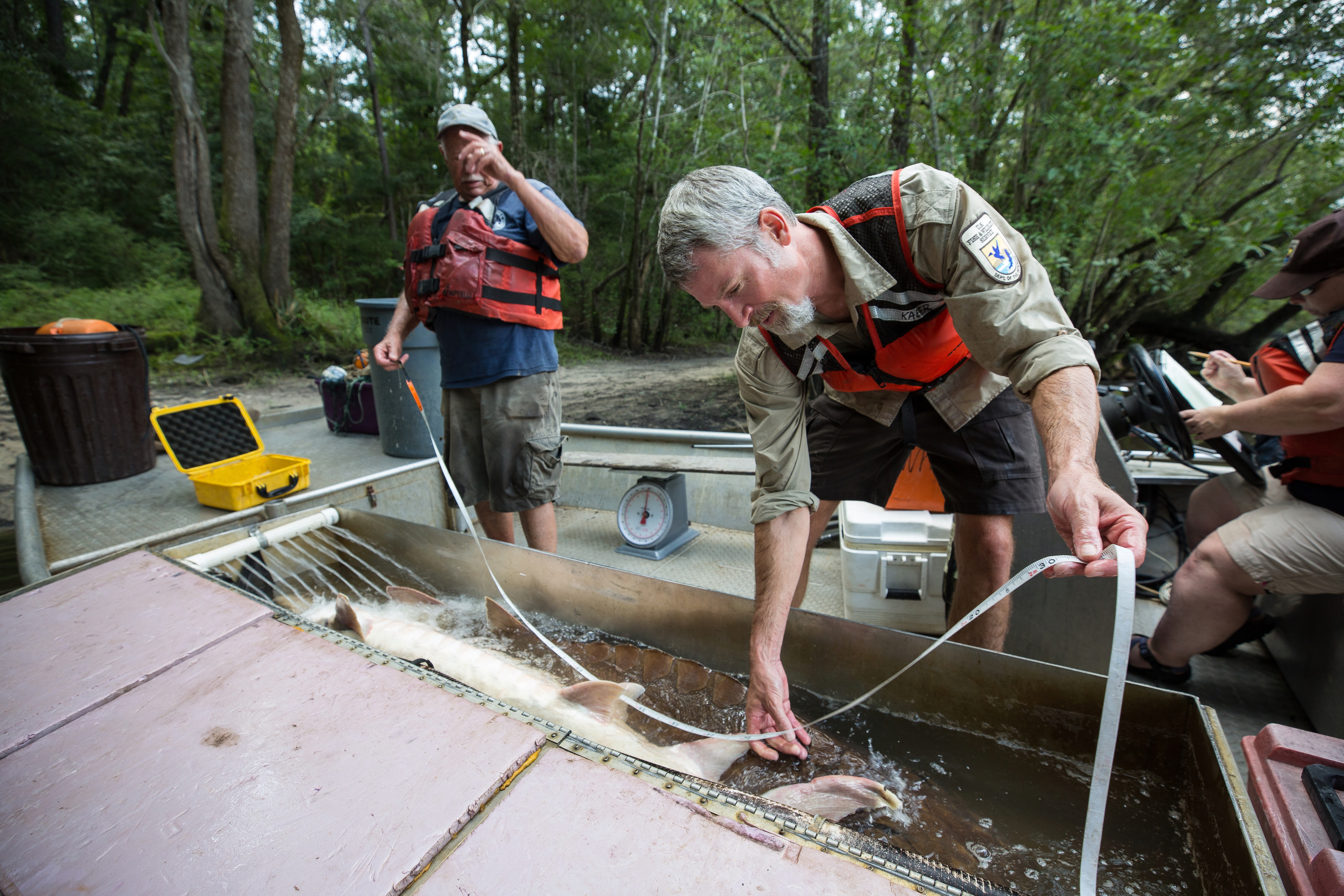 Biologist with gulf sturgeon on the Choctawhatchee River