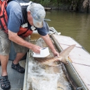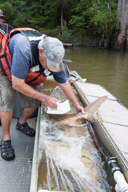 Biologist with gulf sturgeon on the Choctawhatchee River