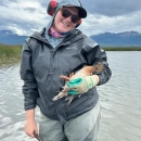 Kela Vicich holds a mallard as she places a band on its leg as part of the 2024 Waterfowl Banding Operations in Alaska.