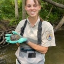 Biologist Jocelynne Samu-Pittard from Alpena Fish and Wildlife Conservation Office in Michigan finds a purple wartyback while taking part in a mussel relocation survey on the Raisin River in Brooklyn, Michigan.