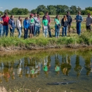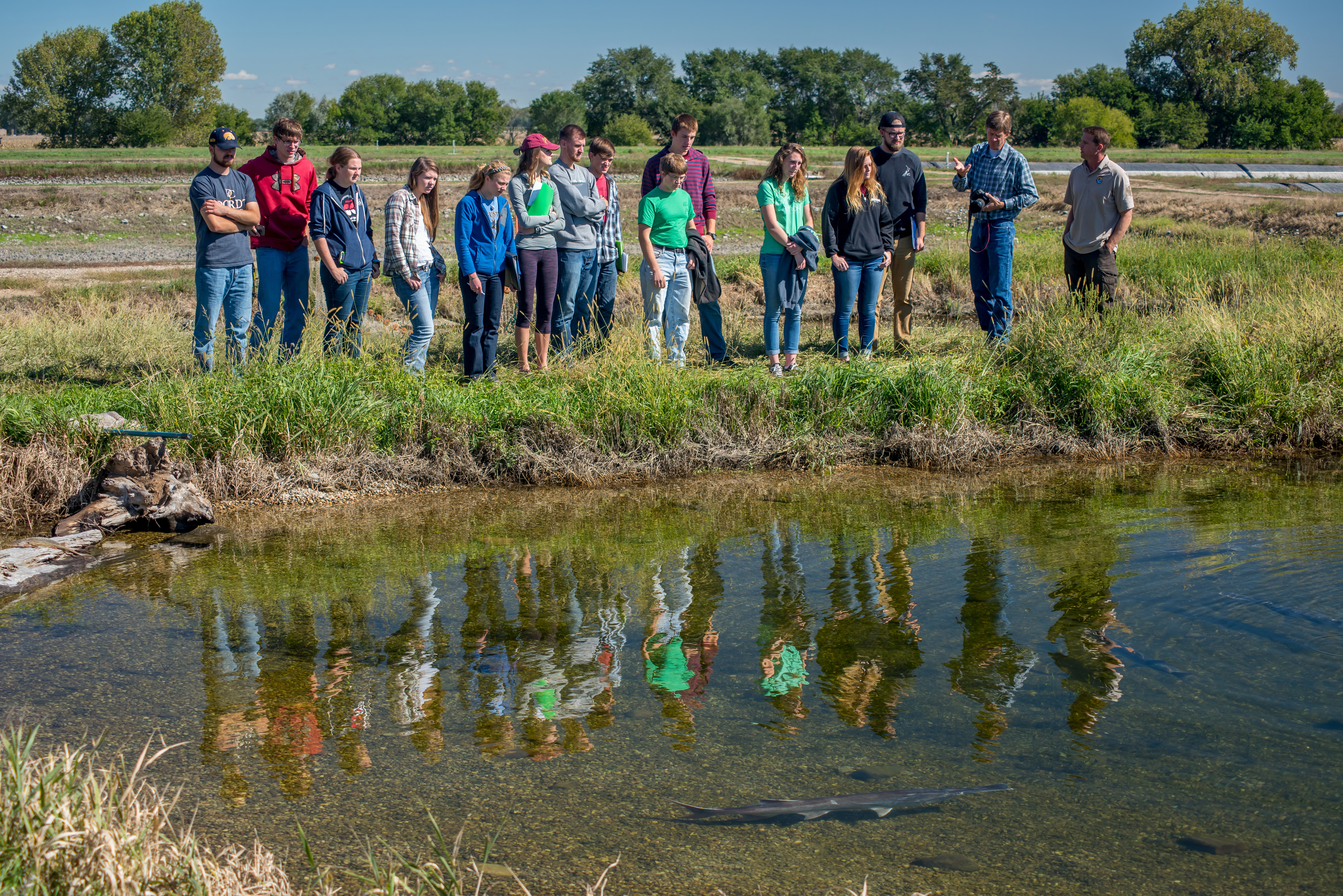 Biologist leads tour of ponds at Gavins Point National Fish Hatchery.