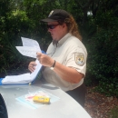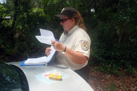 U.S. Fish & Wildlife Service Biologist Lisa Jameson logs in data about a sea turtle stranding during her oil spill response work at Bon Secour National Wildlife Refuge.