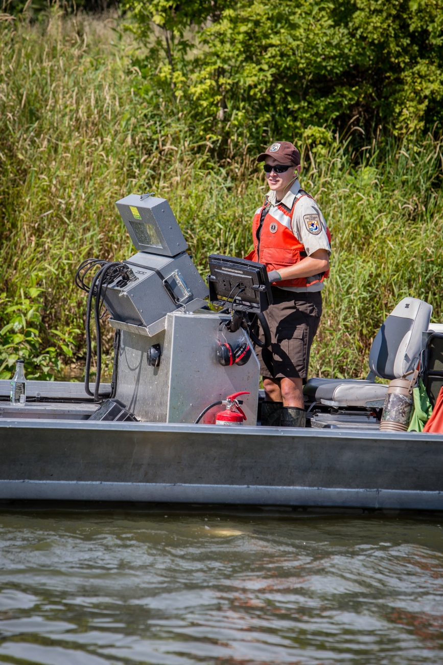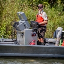 Biologist operates work boat searching for invasive carp on the Mazon River.