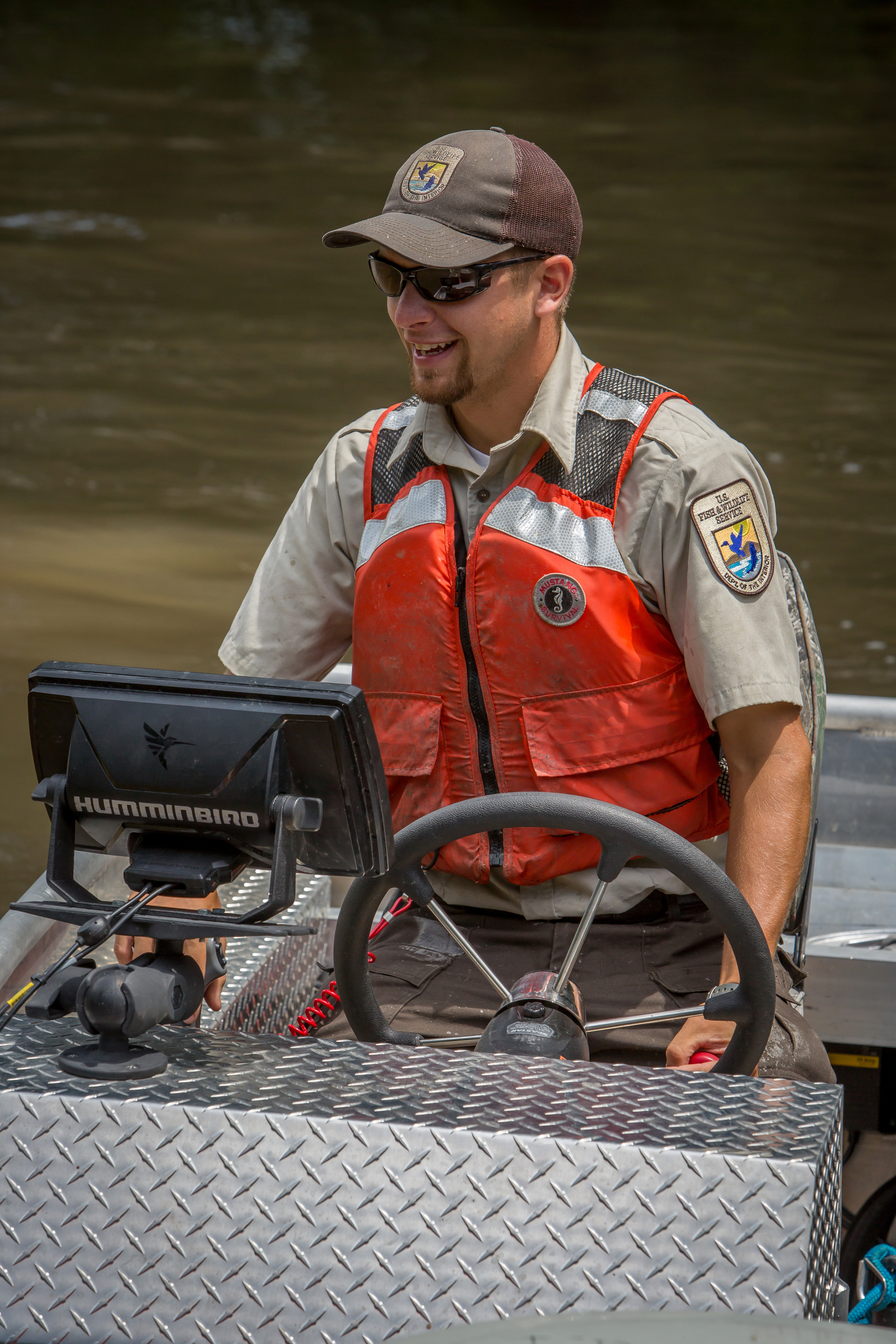Biologist operates work boat searching for invasive carp on the Mazon River.