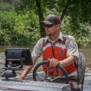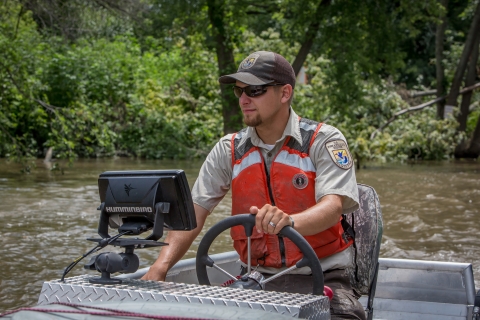 Biologist operates work boat searching for invasive carp on the Mazon River.