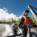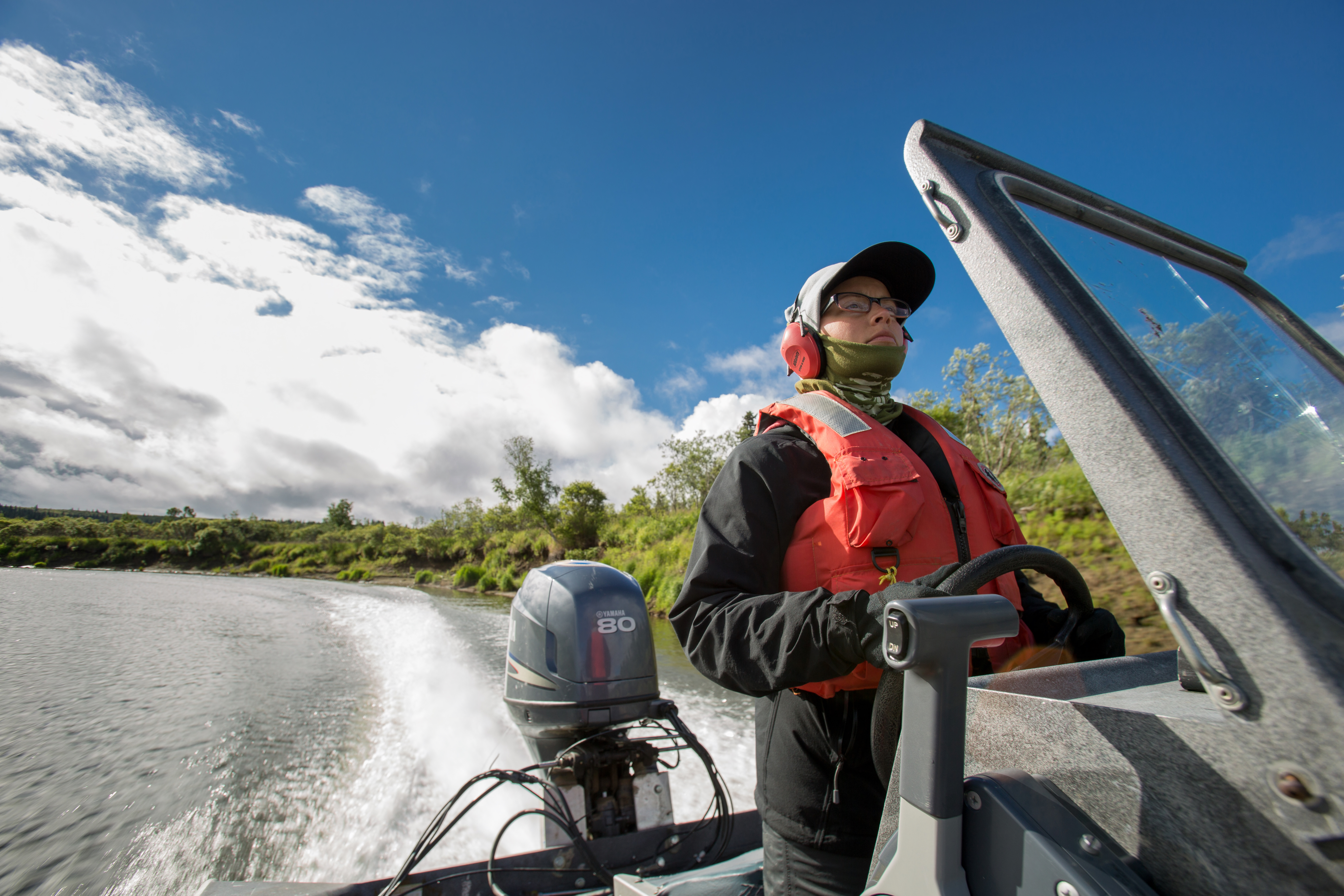 Biologist pilots boat on the Andreafsky River