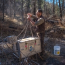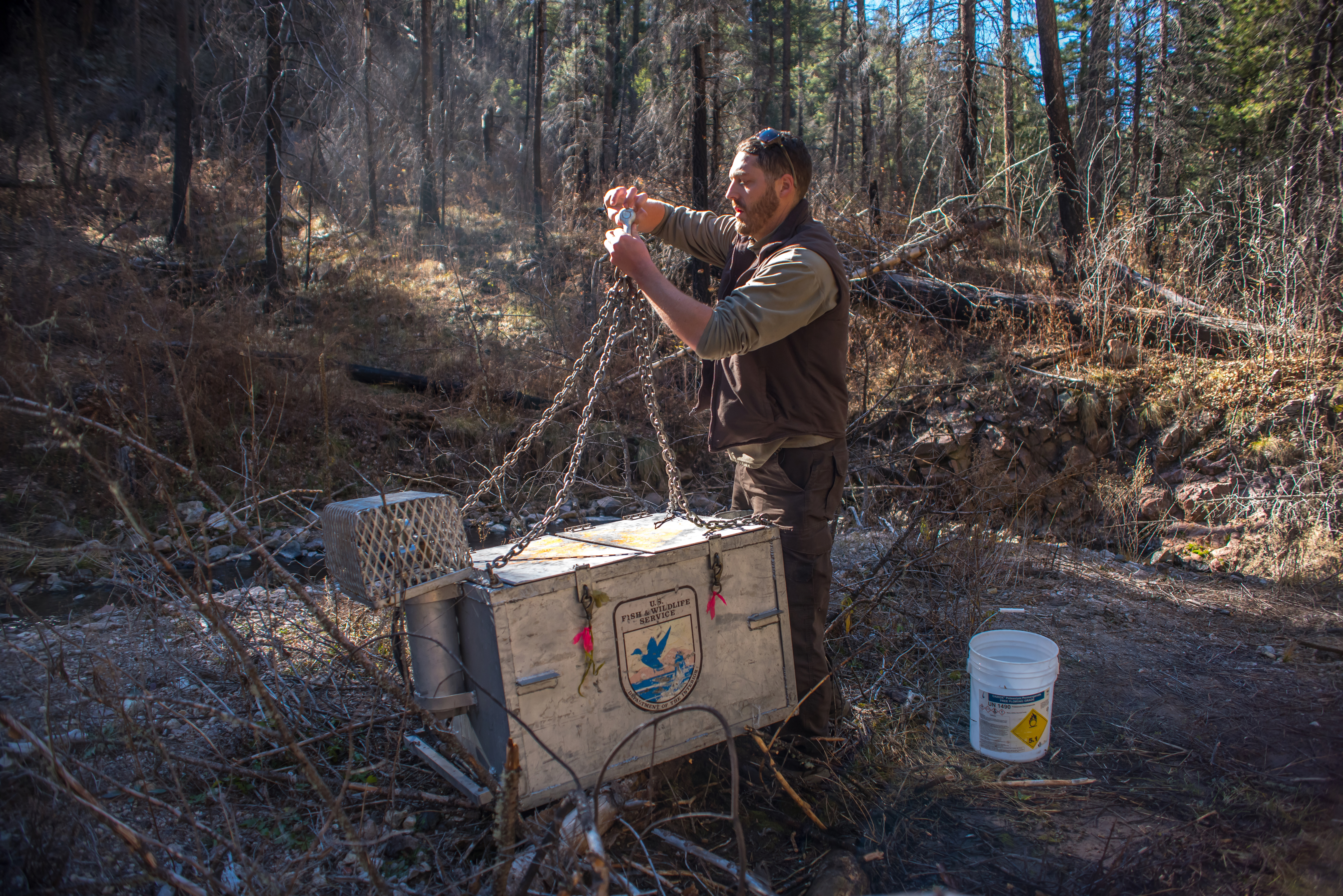 Biologist Andy Deam of USFWS reattaches fish tank to helicopter cable in Mineral Creek in Gila National Forest.