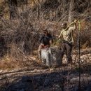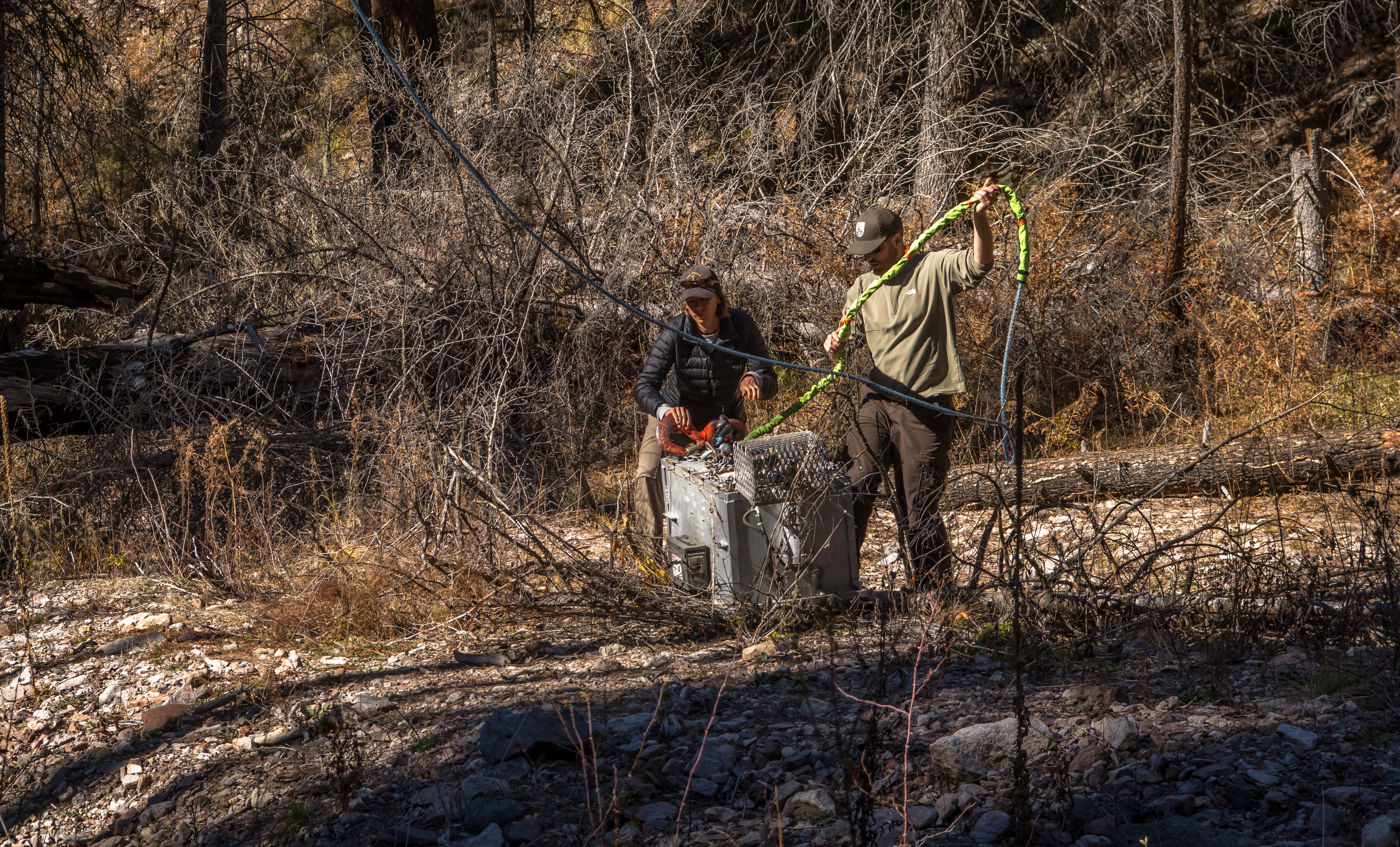Biologist Andy Deam of USFWS reattaches fish tank to helicopter cable in Mineral Creek in Gila National Forest.