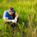 Melanie Olds, USFWS biologist, readying to release a gopher frog that was raised at Bear Bluff National Fish Hatchery. Photo by USFWS, Francis Marion National Forest, May 24, 2019