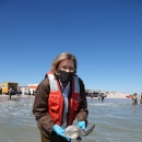 Mary Kay Skoruppa, U.S. Fish and Wildlife Service Sea Turtle Coordinator for Texas, releasing a rehabilitated green sea turtle into the Gulf of Mexico