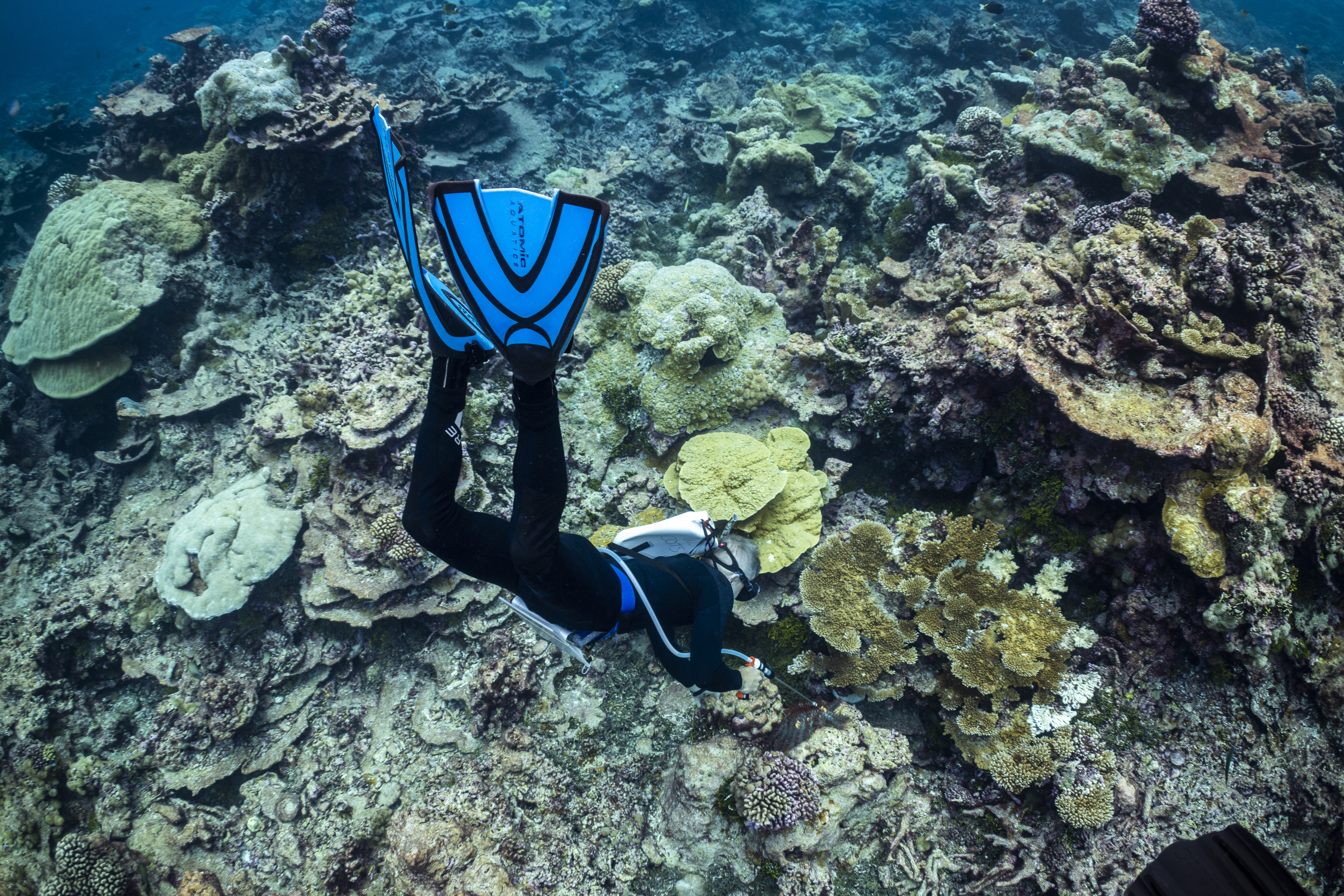 Biologist searches for crown-of-thorns. Invasive species. Venomous thorn-like spines covering upper surface