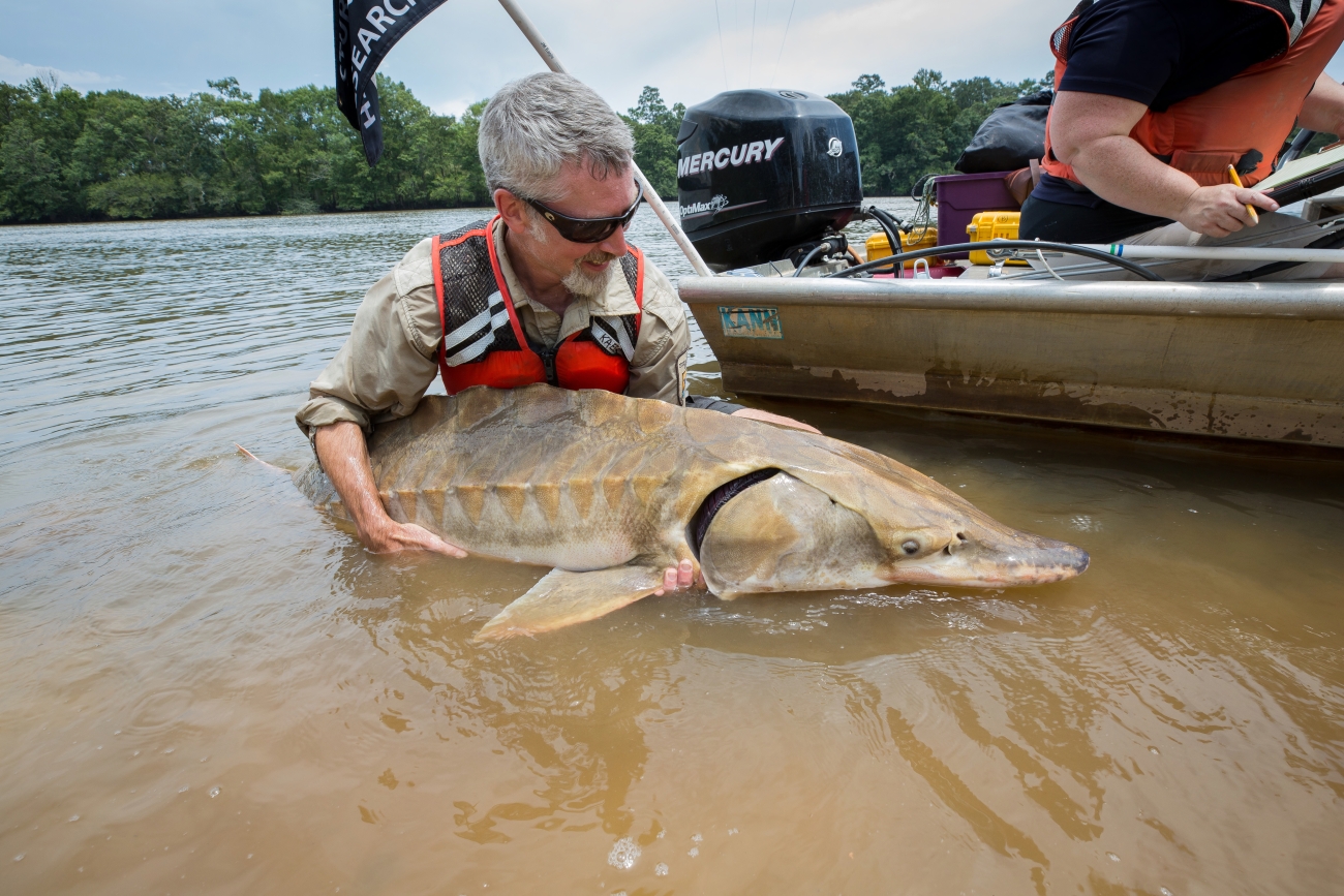 Biologist shows side view of Gulf sturgeon in river