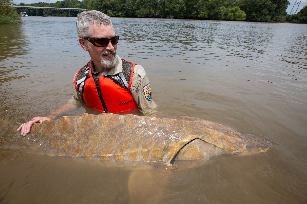 Biologist shows side view of a Gulf sturgeon in river
