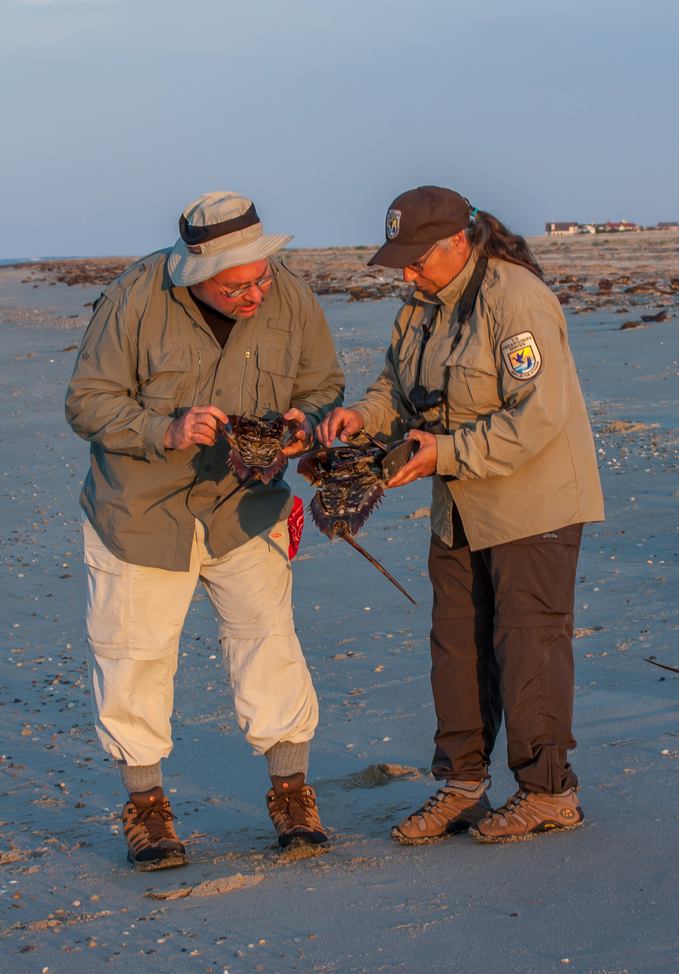 Biologist shows visitor horseshoe crab on beach