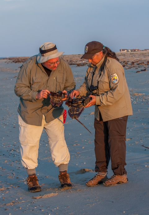 Biologist shows visitor horseshoe crab on beach at Prime Hook NWR.