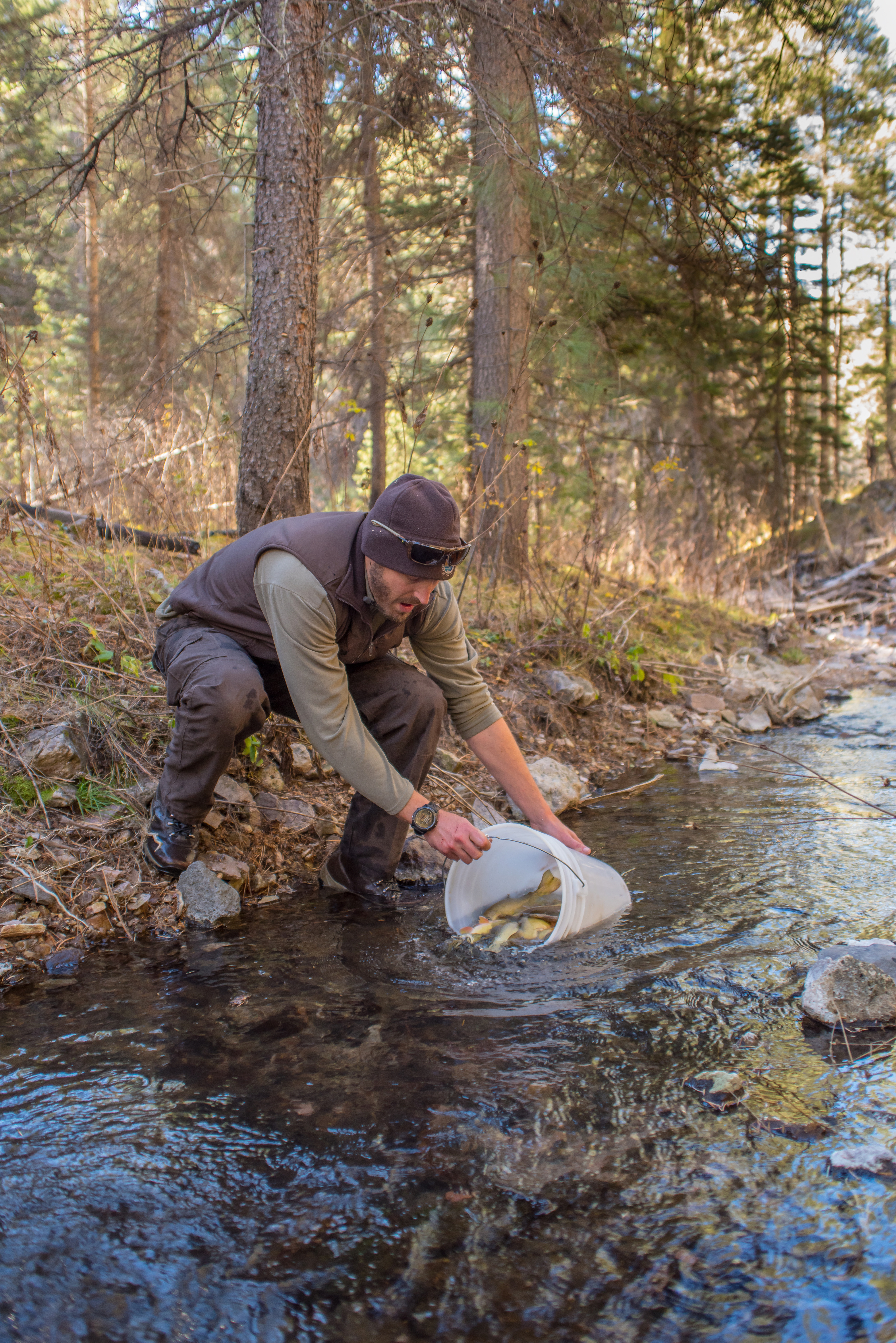 Biologist Andy Dean with USFWS stocks Gila trout into Mineral Creek in Gila National Forest.