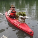 Biologist, Tracy Copeland, with a basket full of water chestnut rosettes handpulled from the creek.