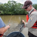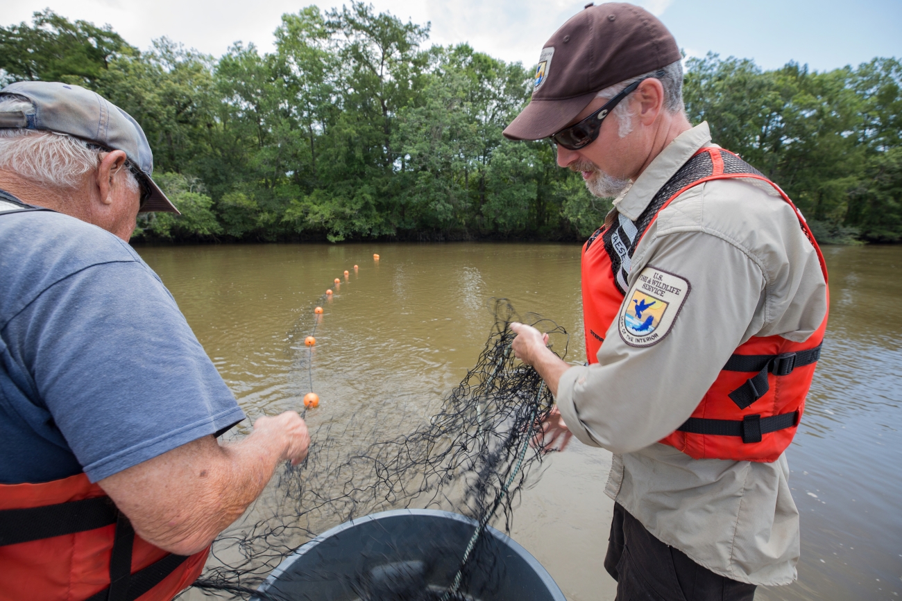 Biologists in boat net Gulf sturgeon in river