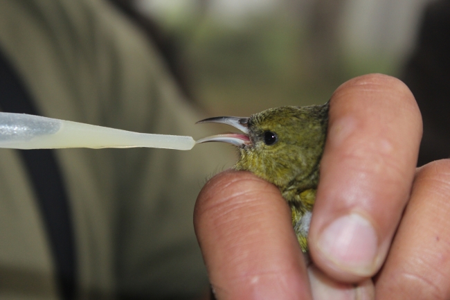 Biologists feed a protein and sugar mixture to each captured bird