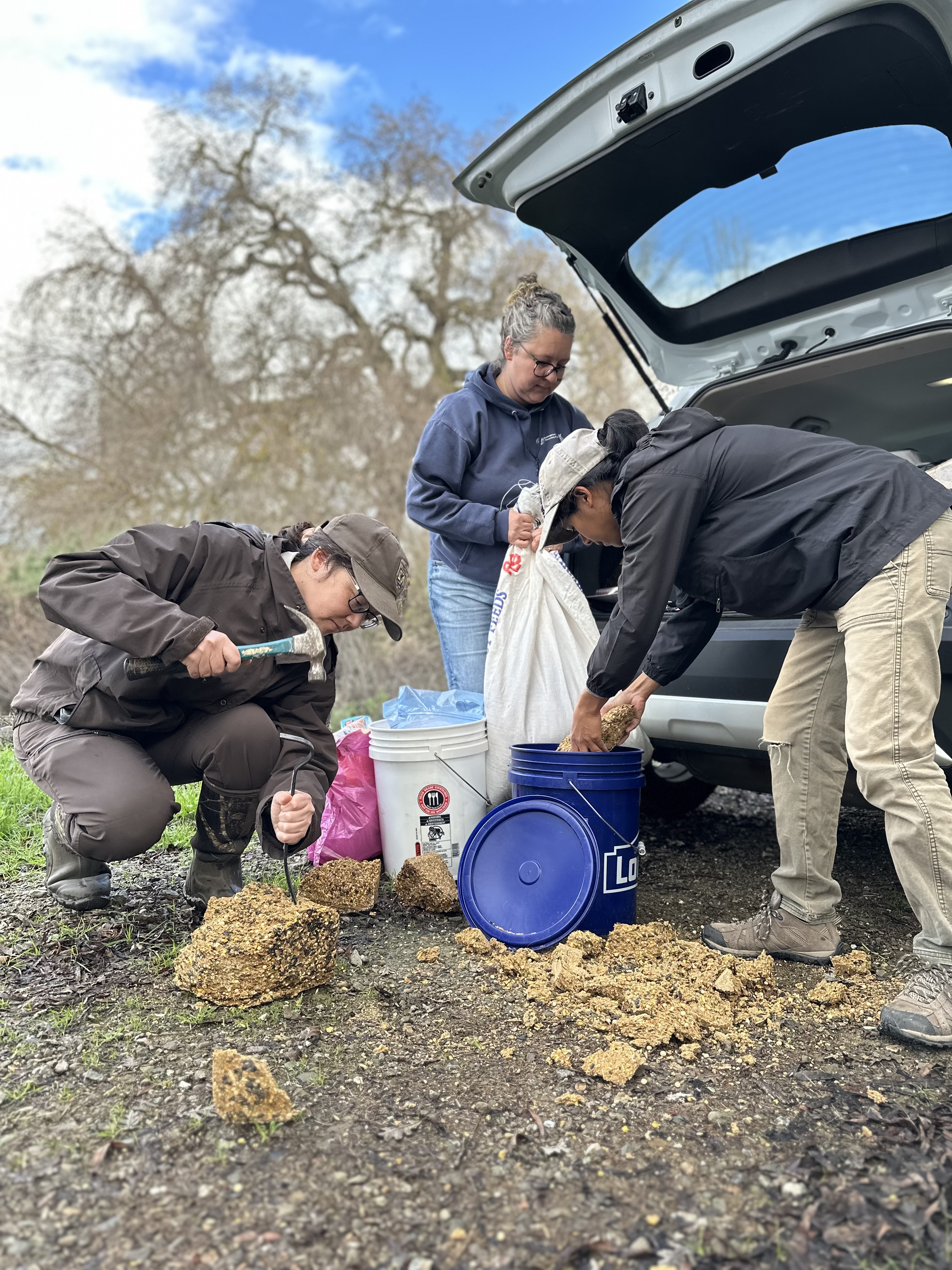 Biologists use hammers to break blocks of chicken feed into small piles of bait for use at camera traps for riparian woodrats.