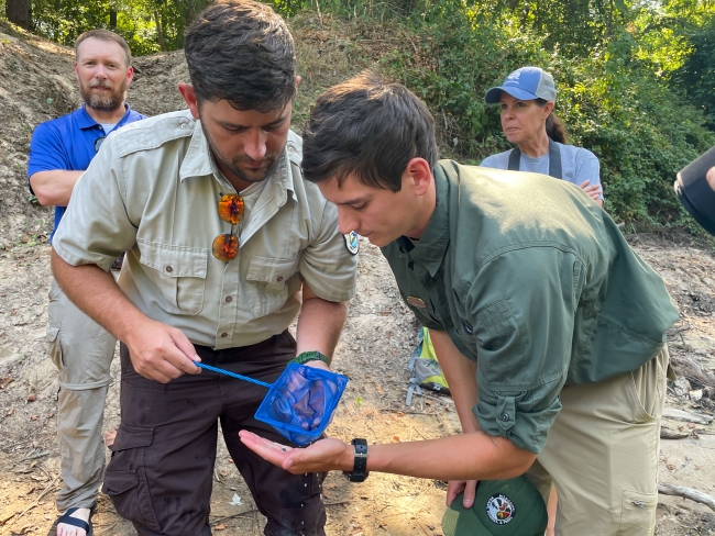 Fish and Wildlife Biologist Jacobe Moore, U.S. Fish and Wildlife Service, and Biologist Robbie Ellwanger, Mississippi Department of Wildlife Fisheries and Parks, prepare a pearl darter for release into the Strong River, Miss., Monday, July 31, 2023. The Strong River is a headwater of the Pearl River, where the pearl darter has not lived for 50 years. (USWFS Photo/Ian Fischer)