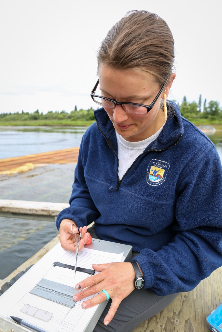 Biologists sample Pacific salmon to get the age, sex, and length of each species