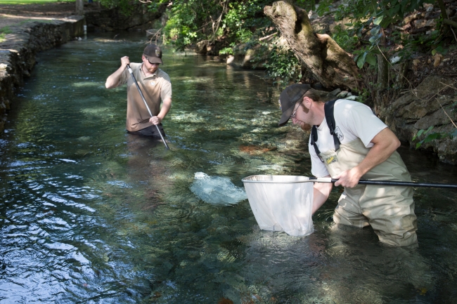 The Comal Springs are the largest in Texas and the American southwest. Seven major springs and dozens of smaller ones occur over a distance of about 4,300 feet at the base of a steep limestone bluff in New Braunfels' Landa Park. The Springs and the Comal River are home for a federally endangered species, the Fountain Darter. Edwards Aquifer,
