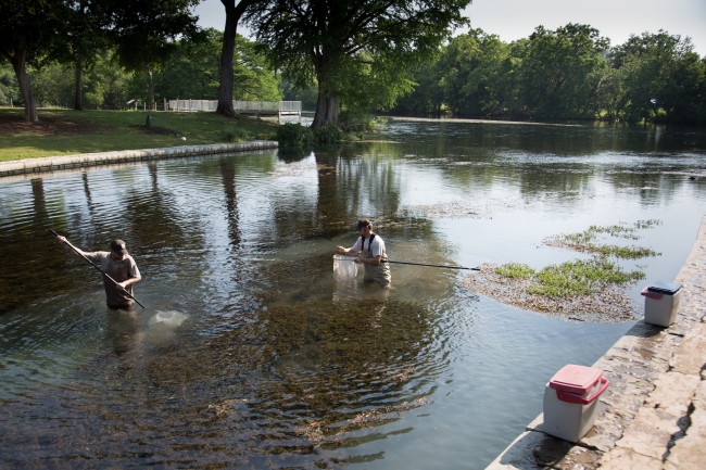 The Comal Springs are the largest in Texas and the American southwest. Seven major springs and dozens of smaller ones occur over a distance of about 4,300 feet at the base of a steep limestone bluff in New Braunfels' Landa Park. The Springs and the Comal River are home for a federally endangered species, the Fountain Darter. Edwards Aquifer,