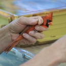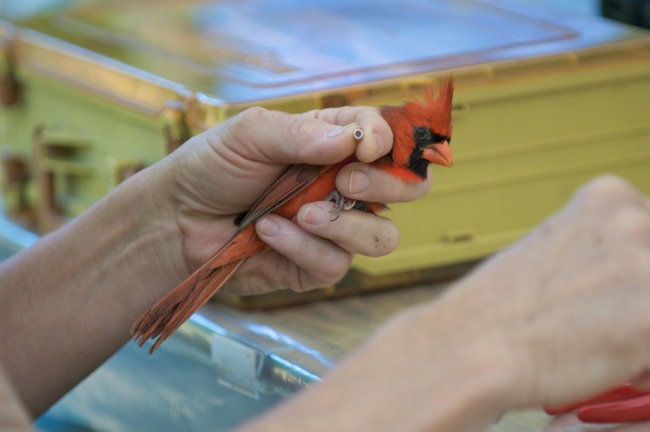Hands of teacher holding male cardinal in preparation for banding; note band being held in fingers; image taken during National Conservation Training Center course OUT8163 Connecting People to Nature Through Birds.