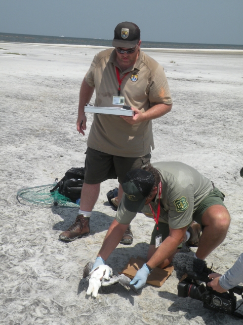 July 15, 2010 Gulfport, MS - Mississippi Team One consists of USFWS Biologist Nate Caswell and USFS Biologist Joe Metzmeier. Their assignment was a long day on Ship Island in Gulf Islands National Seashore. Photo by Bonnie Strawser.