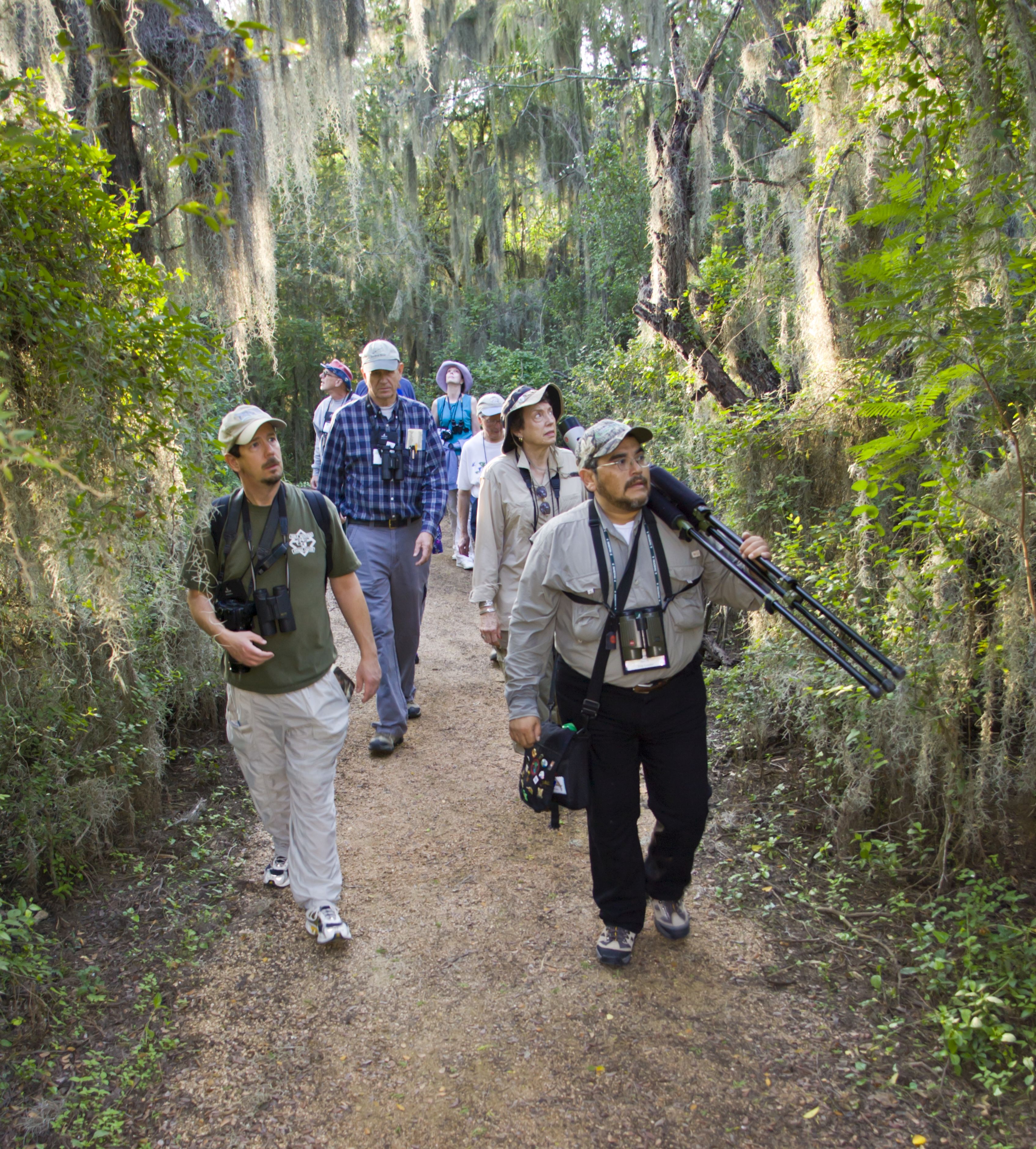Bird festival goers head down the Chachalaca Trail at Santa Ana National Wildlife Refuge, carrying binoculars and camera gear.