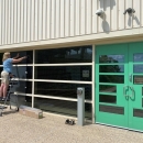 Bird strike prevention film being installed at the Bloomington Visitor Center, near the bird feeder viewing area at Minnesota Valley National Wildlife Refuge.