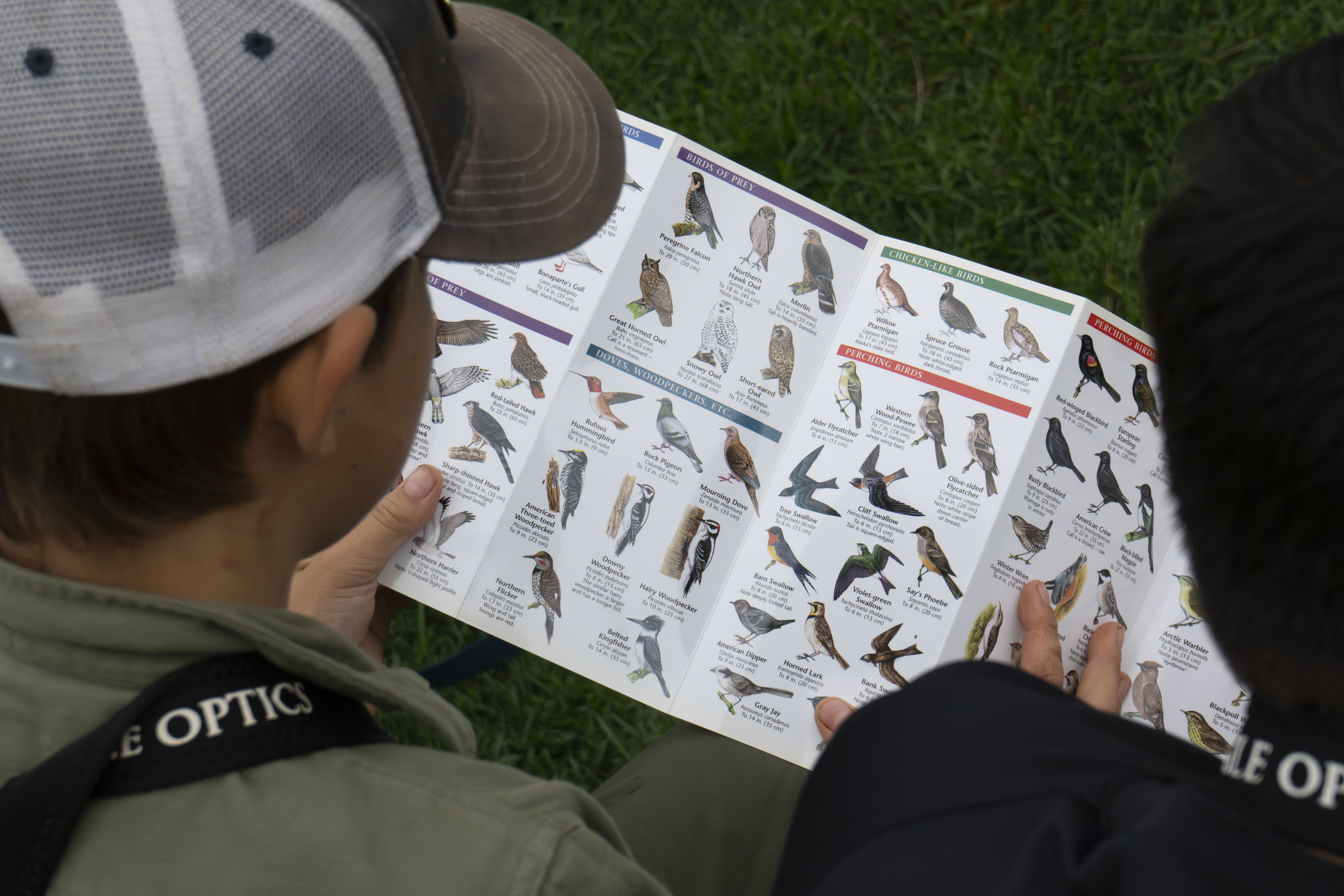 Kids looking through a bird guide at a partnered youth outreach event. U.S. Fish and Wildlife Service biologist Callie Gesmundo leads youth in birding activities at the Z.J. Loussac Library in Anchorage — helping kids practice with binoculars, identify local birds, and explore bird ID guides.