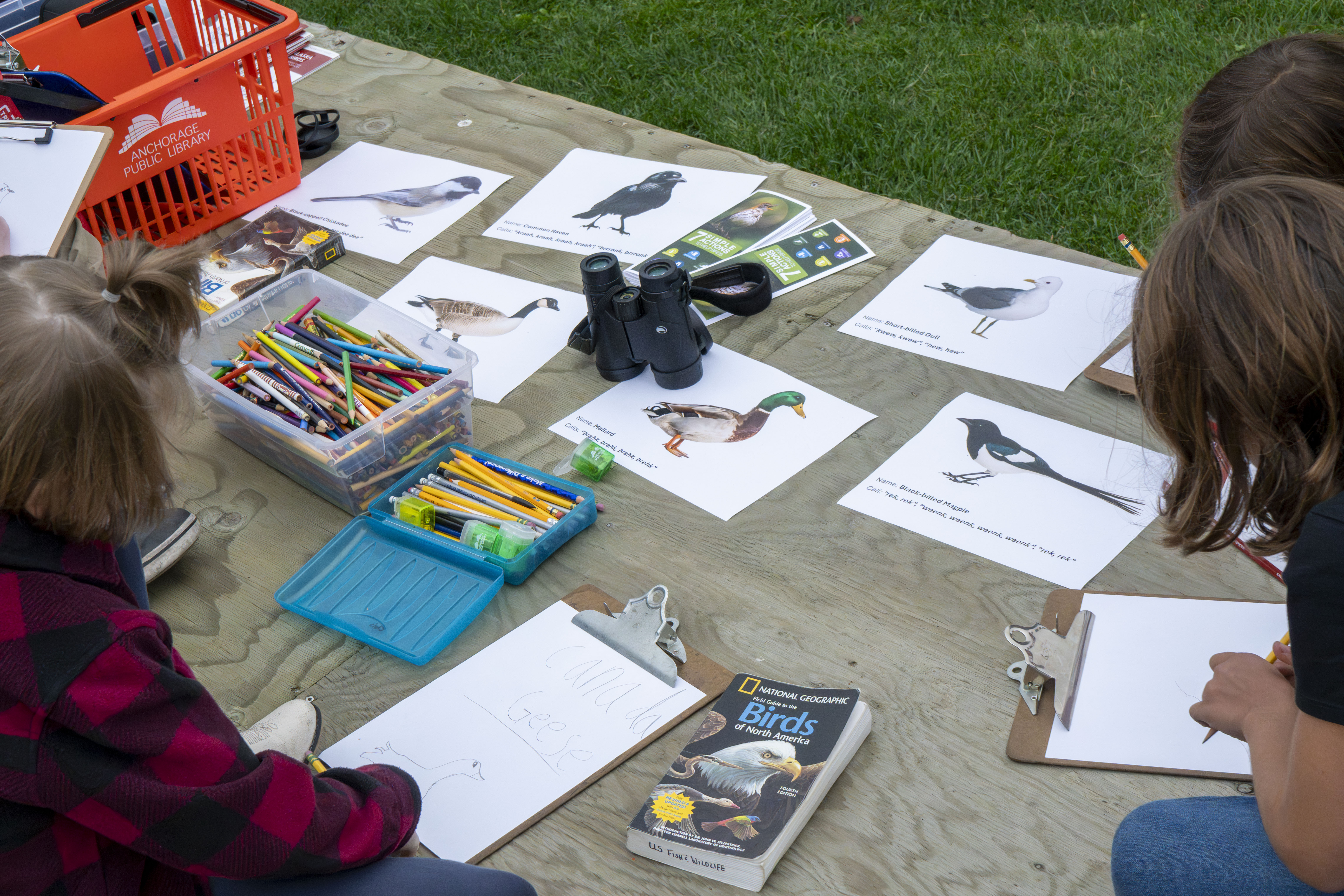 Kids work on their bird IDs and sketches during a public outreach event. U.S. Fish and Wildlife Service biologist Callie Gesmundo leads youth in birding activities at the Z.J. Loussac Library in Anchorage — helping kids practice with binoculars, identify local birds, and explore bird ID guides.