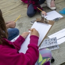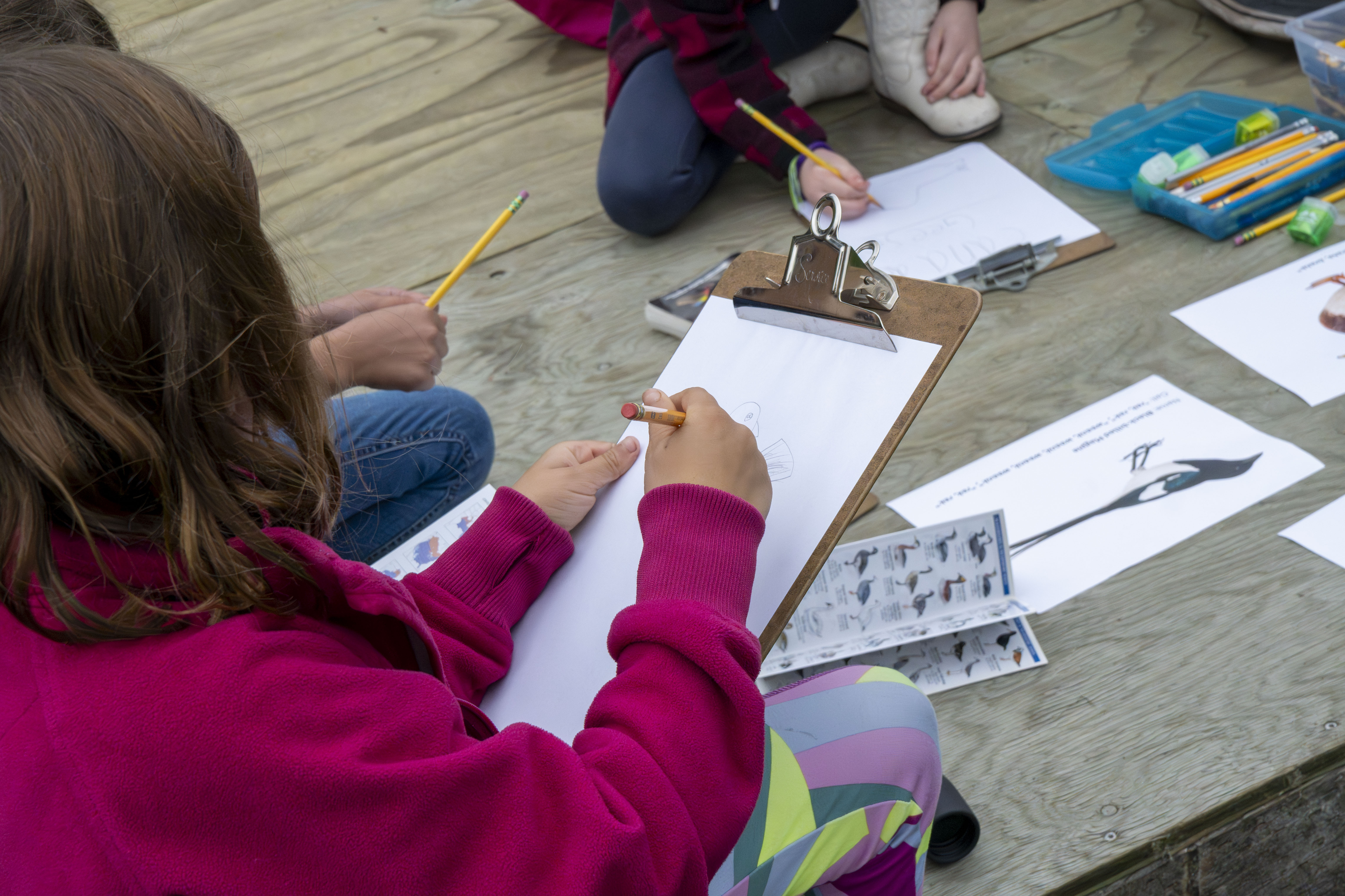 Kids practice their bird ID and sketching skills at a public outreach event. U.S. Fish and Wildlife Service biologist Callie Gesmundo leads youth in birding activities at the Z.J. Loussac Library in Anchorage — helping kids practice with binoculars, identify local birds, and explore bird ID guides.