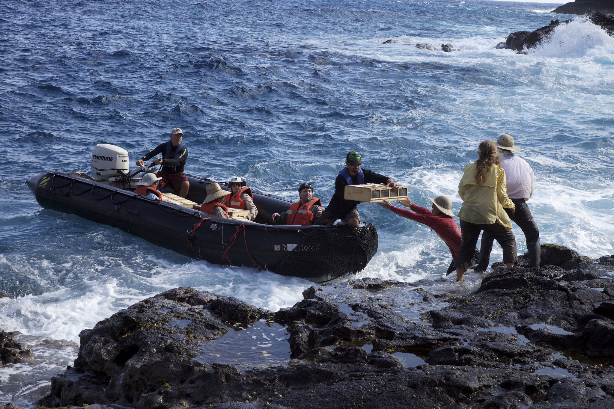 Team members moving ulūlu from the island of Nihoa to the transport vessel.
