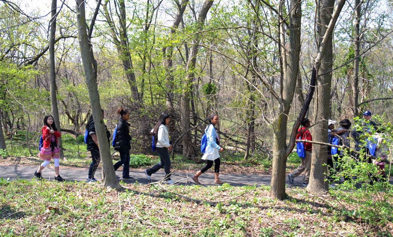 Children are seen touring through the John Heinz National Wildlife Refuge in search of birds.