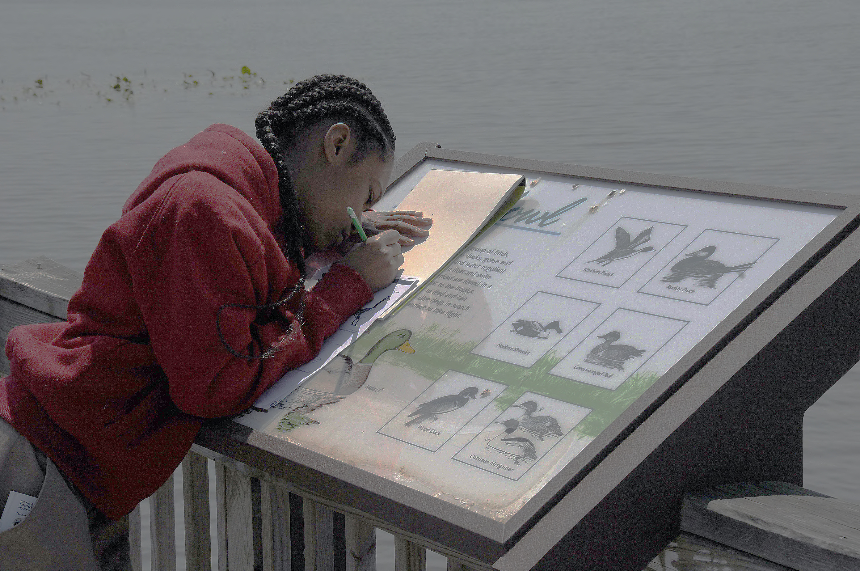 A child is seen trying her hand at drawing birds at the John Heinz National Wildlife Refuge.