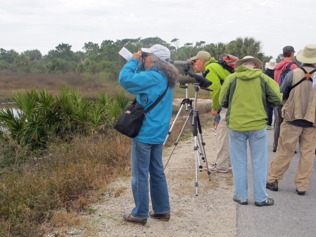 Adults gather to birdwatch along a path.