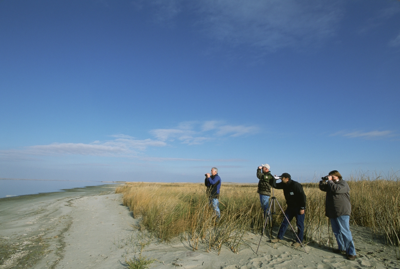 A group of four men birdwatch from the sandy shore at the Long Lake National Wildlife Refuge located in North Dakota.