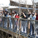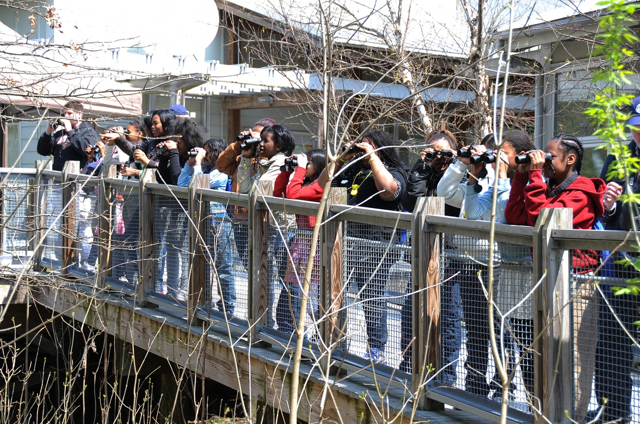 Children look carefully for birds at the John Heinz National Wildlife Refuge